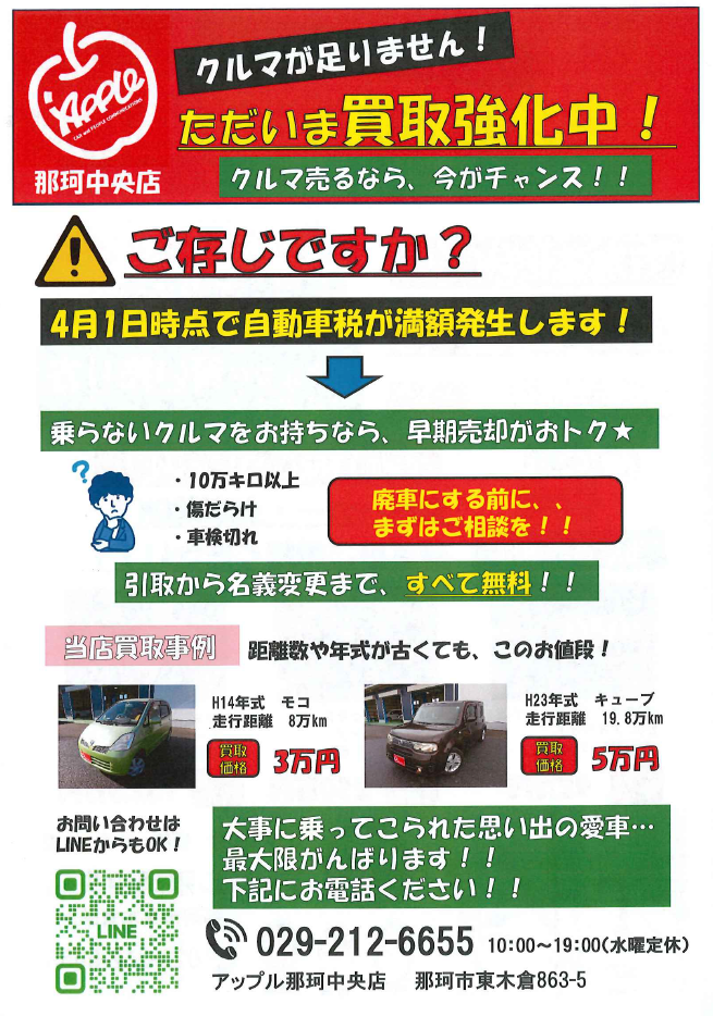 お車のご相談・ 査定だけでもOK! カンタン 入力 30秒 アップルがブランド買取始めました! お電話でも受付中! 受付時間9:30~18:30 029-212-6655 お車のご相談・ 査定だけでもOK! カンタン 入力 30秒 アップルがブランド買取始めました! お電話でも受付中! 受付時間9:30~18:30 029-212-6655 アップルがブランド買取始めました! お電話でも受付中! 受付時間9:30~18:30 029-212-6655 店舗情報 在庫車 スタッフ紹介 ブログ お客様の声 キャンペーン 無料査定 click [ 未分類 ] 2024/03/12 (火) 13:31 【今がチャンス】買取強化月間です! アップル那珂中央店です!4月1日時点のお車の所有者に自動車税が課税になります。当店では廃車費用などはいただいておりません!!「こんな状態だから金額がつくわけない」とあきらめる前に、、ぜひとも一度ご相談くださいませ。ただいま買取強化月間中となります。どんな車も買い取りますのでご相談お待ちしております!!!お気軽にお問い合わせください♪ 2024-03-12 13:31:30 新しい記事へ 古い記事へ 最新記事 2026ゴールデンウィークの営業についてプロボックスのおはなし ②アルトがあるとです(博多弁)キッチンカー 入庫しました☆プロボックスの人気の秘密に迫る 店舗情報に戻る 月別アーカイブ 2026年04月(3)2026年03月(5)2026年02月(4)2026年01月(2)2025年12月(3)2025年11月(5)2025年10月(3)2025年09月(1)2025年08月(2)2025年06月(1)2024年12月(3)2024年08月(1)2024年07月(2)2024年06月(1)2024年04月(1)2024年03月(1)2024年01月(2)2023年12月(3)2023年10月(1)
