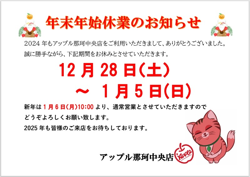 お車のご相談・ 査定だけでもOK! カンタン 入力 30秒 アップルがブランド買取始めました! お電話でも受付中! 受付時間9:30~18:30 029-212-6655 お車のご相談・ 査定だけでもOK! カンタン 入力 30秒 アップルがブランド買取始めました! お電話でも受付中! 受付時間9:30~18:30 029-212-6655 アップルがブランド買取始めました! お電話でも受付中! 受付時間9:30~18:30 029-212-6655 店舗情報 在庫車 スタッフ紹介 ブログ お客様の声 キャンペーン 無料査定 click [ つぶやき ] 2024/12/27 (金) 19:00 ~よいお年をお迎えください!(^^)!~ 2024年もアップル那珂中央店をご利用下さり、ありがとうございました(*^-^*)12月28日~1月5日まで年末年始休業とさせていただきますお休み中のお問い合わせにつきましては、新年1月6日より順次ご対応とさせていただきますので、ご了承くださいますようお願い致しますm(__)m新年もたくさんのお客様のご来店、ご利用を心よりお待ちしております(#^^#)それでは、どうぞよいお年をお迎えください\(^o^)/ 2024-12-27 19:00:00 新しい記事へ 古い記事へ 最新記事 2026ゴールデンウィークの営業についてプロボックスのおはなし ②アルトがあるとです(博多弁)キッチンカー 入庫しました☆プロボックスの人気の秘密に迫る 店舗情報に戻る 月別アーカイブ 2026年04月(3)2026年03月(5)2026年02月(4)2026年01月(2)2025年12月(3)2025年11月(5)2025年10月(3)2025年09月(1)2025年08月(2)2025年06月(1)2024年12月(3)2024年08月(1)2024年07月(2)2024年06月(1)2024年04月(1)2024年03月(1)2024年01月(2)2023年12月(3)2023年10月(1)