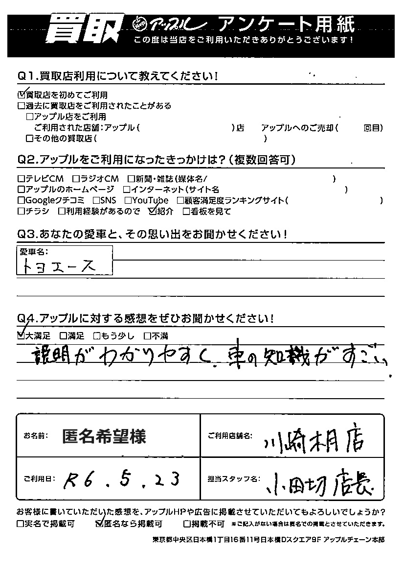 お車のご相談・ 査定だけでもOK! カンタン 入力 30秒 アップルがブランド買取始めました! お電話でも受付中! 受付時間10:00~19:00 0078-6019-6009 お車のご相談・ 査定だけでもOK! カンタン 入力 30秒 アップルがブランド買取始めました! お電話でも受付中! 受付時間10:00~19:00 0078-6019-6009 アップルがブランド買取始めました! お電話でも受付中! 受付時間10:00~19:00 0078-6019-6009 店舗情報 在庫車 スタッフ紹介 ブログ お客様の声 キャンペーン 無料査定 click お客様の声 ご記入日: 2024/06/29 匿名希望様 車名:トヨタ トヨエース ご利用日:R6年5月23日 担当:小田切店長アップルに対する感想をぜひお聞かせください!説明がわかりやすく車の知識がすごい 前へ 次へ お客様の声一覧を見る