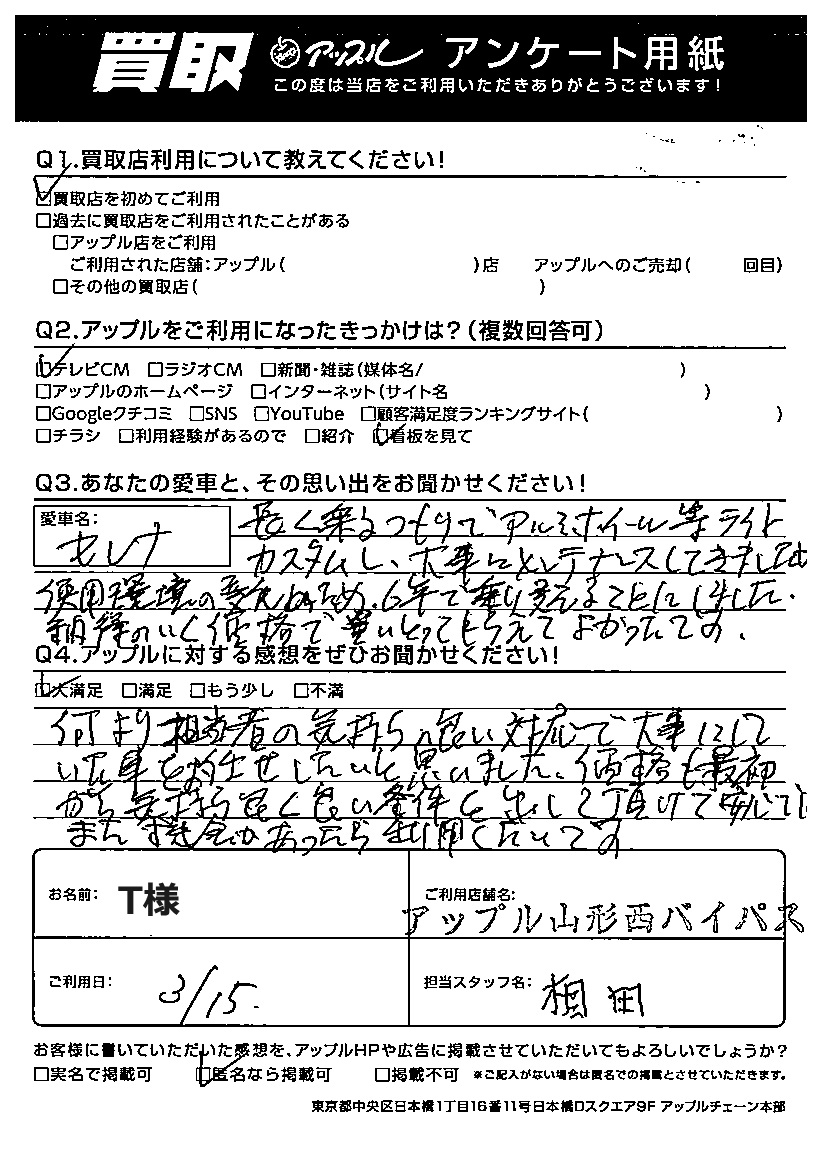 A:何より担当者の気持ちの良い対応で大事にしていた車をお任せしたいと思いました。