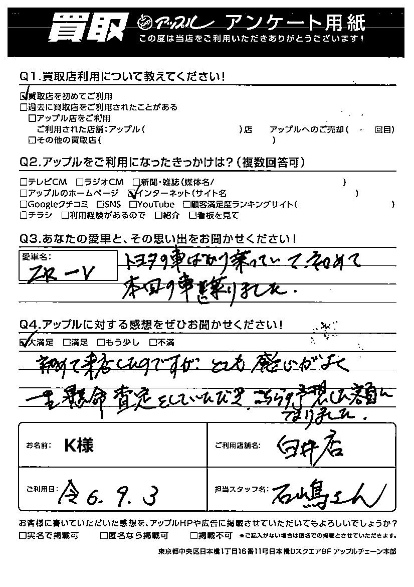 初めて来店したのですが、とても感じがよく一生懸命査定をしていただき、こちらの予想した額になりました。