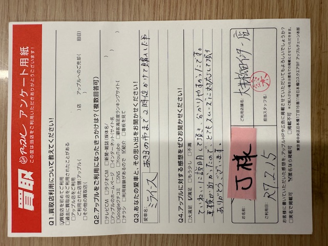 お車のご相談・ 査定だけでもOK! カンタン 入力 30秒 アップルがブランド買取始めました! お電話でも受付中! 受付時間10:00~18:00 0120-626-123 お車のご相談・ 査定だけでもOK! カンタン 入力 30秒 アップルがブランド買取始めました! お電話でも受付中! 受付時間10:00~18:00 0120-626-123 アップルがブランド買取始めました! お電話でも受付中! 受付時間10:00~18:00 0120-626-123 店舗情報 在庫車 スタッフ紹介 ブログ お客様の声 キャンペーン 無料査定 click お客様の声 ご記入日: 2025/02/15 J様 車名:ダイハツ ミライース Q3.あなたの愛車とその思い出をお聞かせください!あきる野市まで2時間かけて購入した車。 前へ 次へ お客様の声一覧を見る