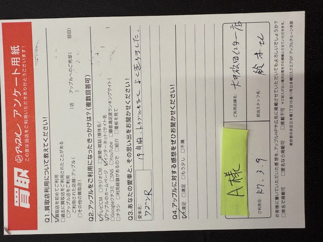 お車のご相談・ 査定だけでもOK! カンタン 入力 30秒 アップルがブランド買取始めました! お電話でも受付中! 受付時間10:00~18:00 0120-626-123 お車のご相談・ 査定だけでもOK! カンタン 入力 30秒 アップルがブランド買取始めました! お電話でも受付中! 受付時間10:00~18:00 0120-626-123 アップルがブランド買取始めました! お電話でも受付中! 受付時間10:00~18:00 0120-626-123 店舗情報 在庫車 スタッフ紹介 ブログ お客様の声 キャンペーン 無料査定 click お客様の声 ご記入日: 2025/03/09 A様 車名:スズキ ワゴンR Q3.あなたの愛車と、その思い出をお聞かせください!19年間トラブルもなくよく走りました。 前へ 次へ お客様の声一覧を見る