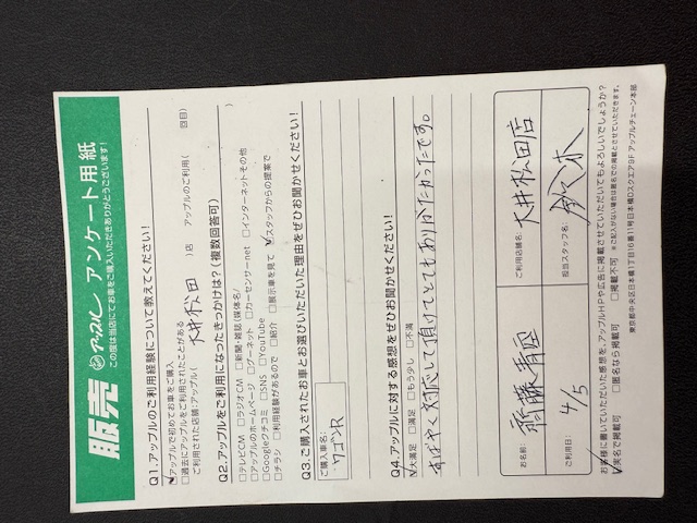 お車のご相談・ 査定だけでもOK! カンタン 入力 30秒 アップルがブランド買取始めました! お電話でも受付中! 受付時間10:00~18:00 0120-626-123 お車のご相談・ 査定だけでもOK! カンタン 入力 30秒 アップルがブランド買取始めました! お電話でも受付中! 受付時間10:00~18:00 0120-626-123 アップルがブランド買取始めました! お電話でも受付中! 受付時間10:00~18:00 0120-626-123 店舗情報 在庫車 スタッフ紹介 ブログ お客様の声 キャンペーン 無料査定 click お客様の声 ご記入日: 2025/04/05 齊藤 青空様 車名:スズキ ワゴンR Q4.アップルに対する感想を是非お聞かせください!すばやく対応して頂けてとてもありがたかったです。 前へ 次へ お客様の声一覧を見る