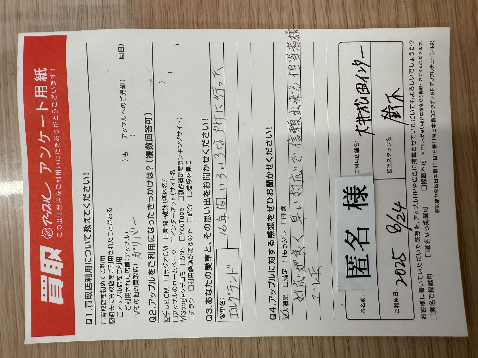 お車のご相談・ 査定だけでもOK! カンタン 入力 30秒 アップルがブランド買取始めました! お電話でも受付中! 受付時間10:00~18:00 0120-626-123 お車のご相談・ 査定だけでもOK! カンタン 入力 30秒 アップルがブランド買取始めました! お電話でも受付中! 受付時間10:00~18:00 0120-626-123 アップルがブランド買取始めました! お電話でも受付中! 受付時間10:00~18:00 0120-626-123 店舗情報 在庫車 スタッフ紹介 ブログ お客様の声 キャンペーン 無料査定 click お客様の声 ご記入日: 2025/08/24 I様 車名:日産 エルグランド Q3.あなたの愛車と、その思い出をお聞かせください!16年間いろいろな所に行ったQ4.アップルに対する感想を是非お聞かせください!対応が良く早い対応で信頼出来る担当者様でした 前へ 次へ お客様の声一覧を見る