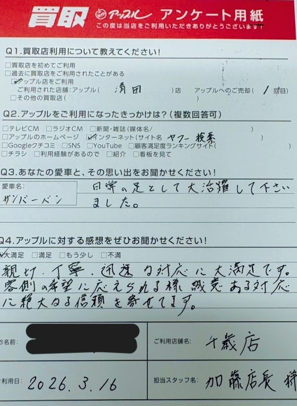 北海道・夕張郡 匿名希望様 車名:スバル サンバー